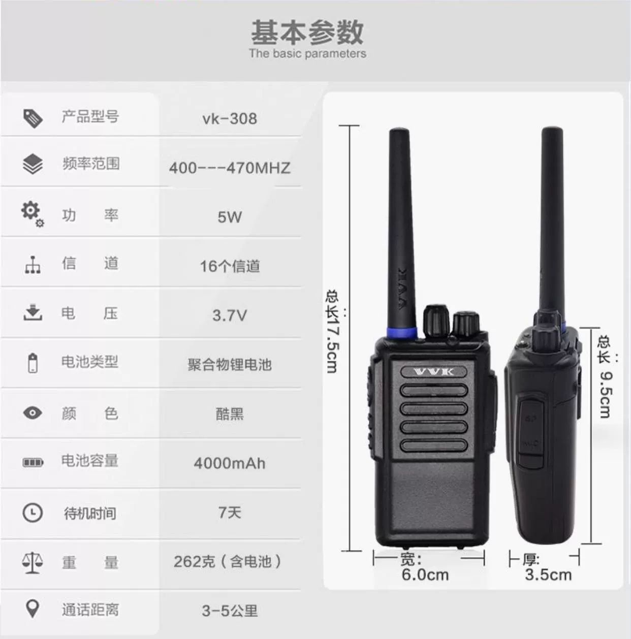 威科三通VK308对讲机匠心打造的无线通讯设备,专为建筑工地、酒店餐饮、交通物流等场景设计。作为20年军工品质的传承者,该机型以密封结构、强力信号穿透和智能节电技术为核心优势,满足复杂环境下的高效通讯需求。其紧凑机身与16信道设计,确保用户在不同任务中快速切换,提升团队协作效率。VK308对讲机主打便捷操作和稳定通信。其核心特点包括一键自动对频功能,可快速完成多台设备互联,无需复杂设置。