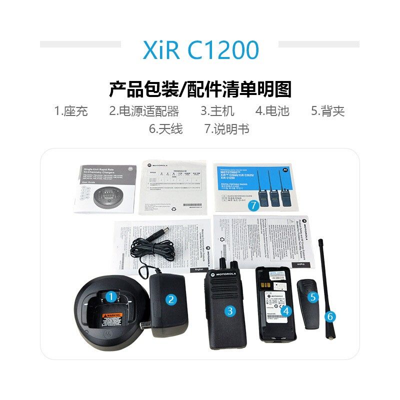 摩托罗拉XIR C1200是摩托罗拉系统推出的数字/模拟双模商用对讲机,定位于入门级用户,支持UHF 403-480MHz频段,输出功率分4W高功率和1W低功率两档。该机型采用粗糙颗粒外壳设计,尺寸为120×55×41.7mm,重量895克,顶部设信道旋钮、音量开关及挂扣,左侧配置PTT按钮,右侧为耳机插孔和M-USB接口,便于写频操作。其IP54防尘防水等级使其适用于地铁、机场、工地、医院、物业、酒店、物流车队等多种复杂环境。